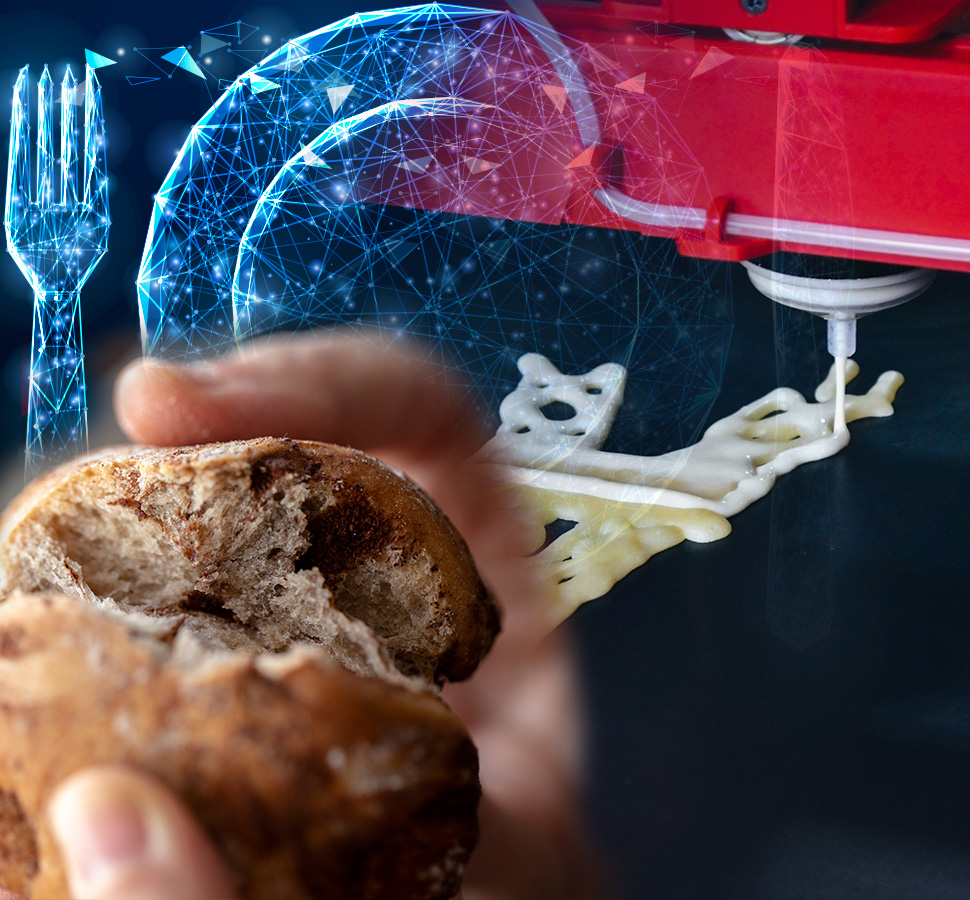 3D-printed food is made with standard 3D printers but using soft, edible materials that can be extruded through a nozzle. The printer follows a computer-generated model to deposit layers of material with extreme precision to create a final three-dimensional entrée. Food researchers must experiment with ingredient formulations and material properties such as viscosity to create the desired structure, flavor, and texture.
