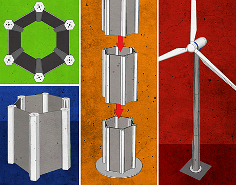 "Our system will save costs on transportation, raw materials, and construction," he says. "Construction costs will also come down as more towers are built. Our tower design is more durable than steel and can be easily tailored to meet any turbine size and tower height."