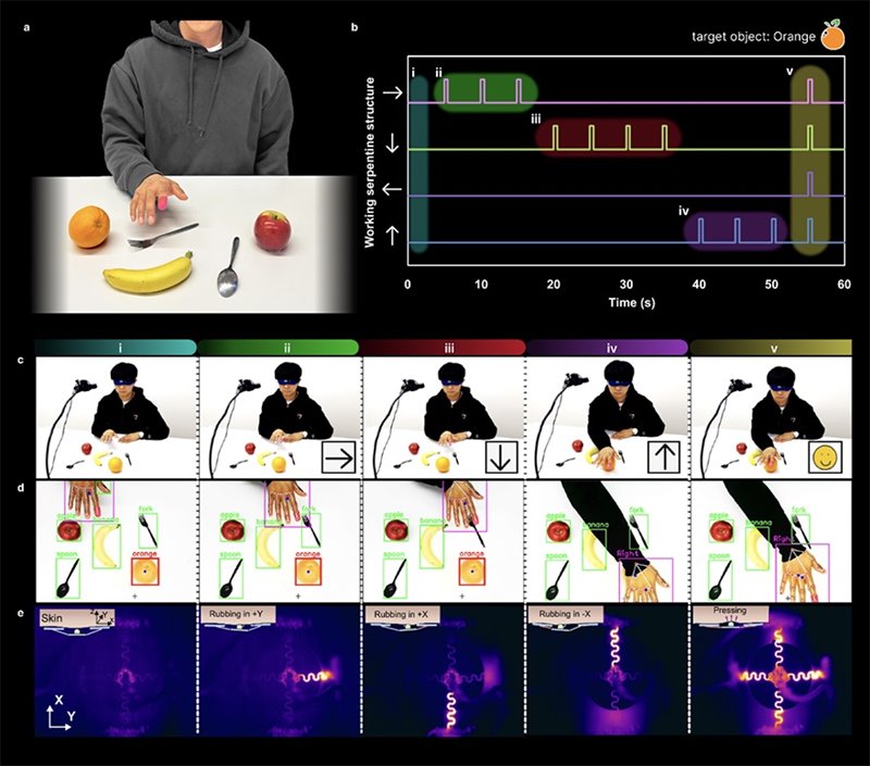 Or, if someone with a visual impairment wanted to use virtual reality to identify an object on the counter, the wireless, skin-mounted, thimble-sized device would provide guidance to the right place.