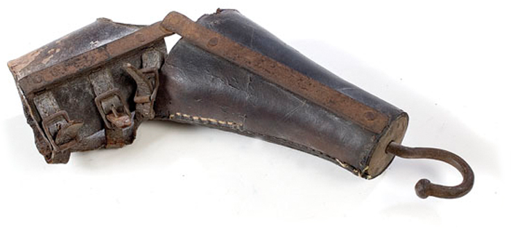 A mid-19th century prosthetic arm made of leather, wood, and iron.